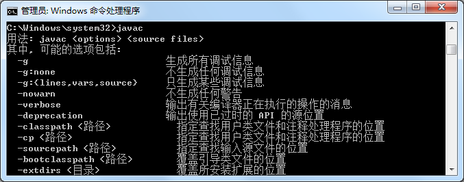 设置完path环境变量后,再次运行“javac”命令,找不到javac.exe命令的错误情况就不会再出现了,命令行中会显示“javac”命令的帮助信息,如下图所示:
