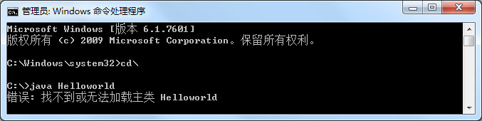 打开命令提示行窗口,进入C盘根目录下,然后执行“java HelloWorld”命令,运行之前编译好的Java程序,结果会报错,如下图所示: