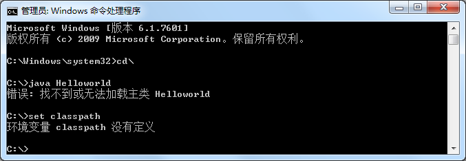 从上图中可以看出,当前classpath环境变量没有设置,为了让Java虚拟机能找到所需的class文件,就需要对classpath环境变量进行设置,在命令行窗口输入下面的命令: