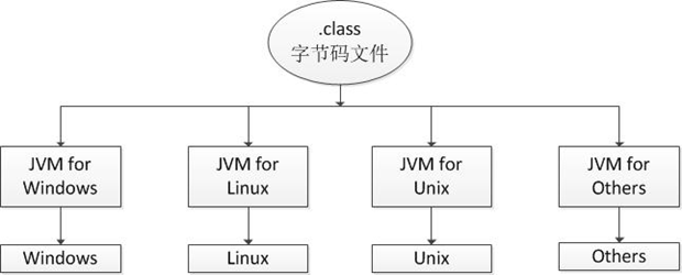 从上图可以看出,不同的操作系统需要使用不同版本的虚拟机,这种方式使得Java语言具有“一次编写,到处运行(write once,run anywhere)”的特性,有效地解决了程序设计语言在不同操作系统编译时产生不同机器代码的问题,大大降低了程序开发和维护的成本。