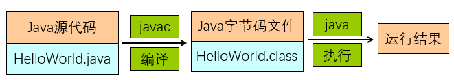 - 使用“java HelloWorld”命令启动Java虚拟机运行程序,Java虚拟机首先将编译好的字节码文件加载到内存,这个过程被称为类加载,它是由类加载器完成的,然后虚拟机针对加载到内存中的Java类进行解释执行,便可看到运行结果。