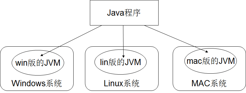 通过上面的分析不难发现,Java程序是由虚拟机负责解释执行的,而并非操作系统。这样做的好处是可以实现跨平台性,也就是说针对不同的操作系统可以编写相同的程序,只需安装不同版本的虚拟机即可,如下图所示: