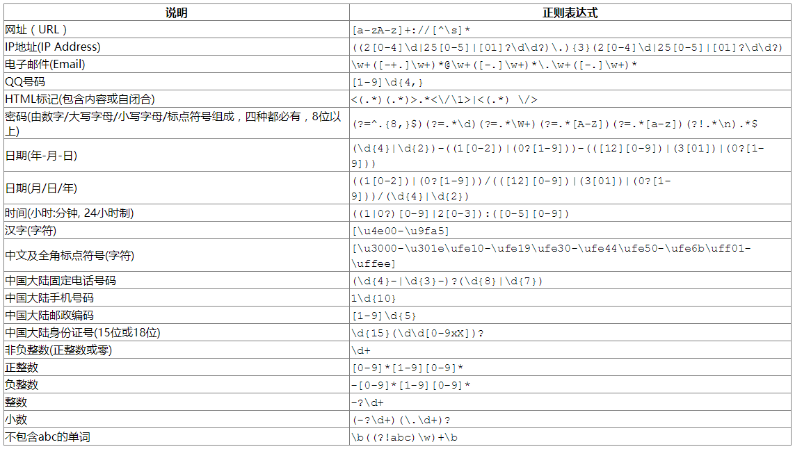 说明:正则表达式通常用于两种任务:1.验证,2.搜索/替换。用于验证时,通常需要在前后分别加上^和$,以匹配整个待验证字符串;搜索/替换时是否加上此限定则根据搜索的要求而定,此外,也有可能要在前后加上\b而不是^和$。此表所列的常用正则表达式,除个别外均未在前后加上任何限定,请根据需要,自行处理。