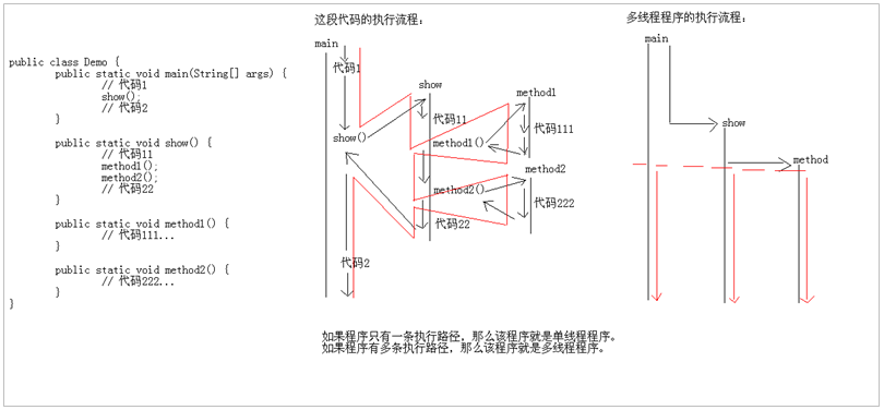 由上图中程序的调用流程可知,这个程序只有一个执行流程,所以这样的程序就是单线程程序。假如一个程序有多条执行流程,那么,该程序就是多线程程序。