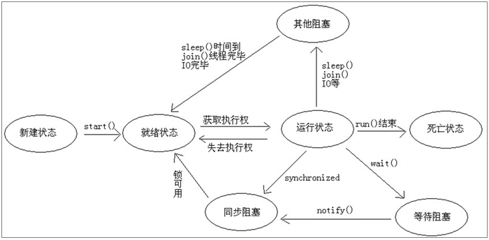 新建,就绪,运行,阻塞(同步阻塞,等待阻塞,其他阻塞),死亡