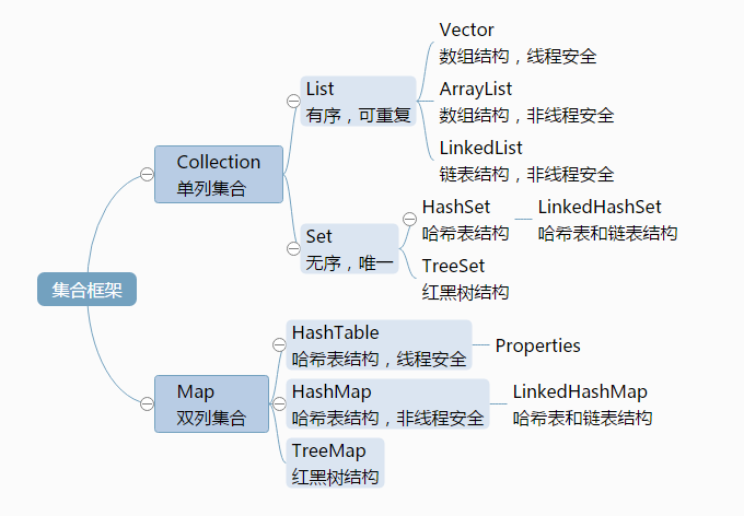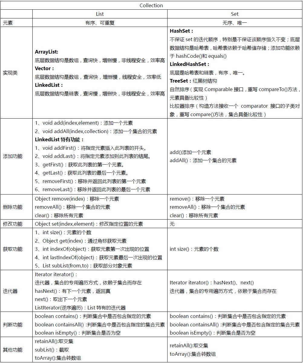 Collection:单列集合类的根接口,用于存储一系列符合某种规则的元素,它有两个重要的子接口,分别是List和Set。其中,List的特点是元素有序、元素可重复。Set的特点是元素无序,而且不可重复。List接口的主要实现类有ArrayList和LinkedList,Set接口的主要实现类有HashSet和TreeSet。