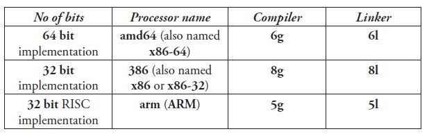 g = 编译器:将源代码编译为项目代码(程序文本) l = 链接器:将项目代码链接到可执行的二进制文件(机器代码)(相关的 C 编译器名称为 6c、8c 和 5c,相关的汇编器名称为 6a、8a 和 5a)