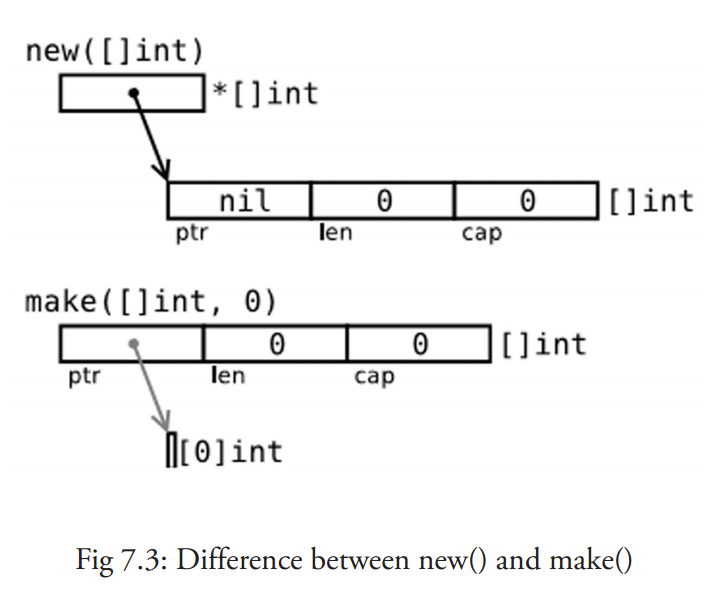 换言之,new() 函数分配内存,make() 函数初始化;下图给出了区别: