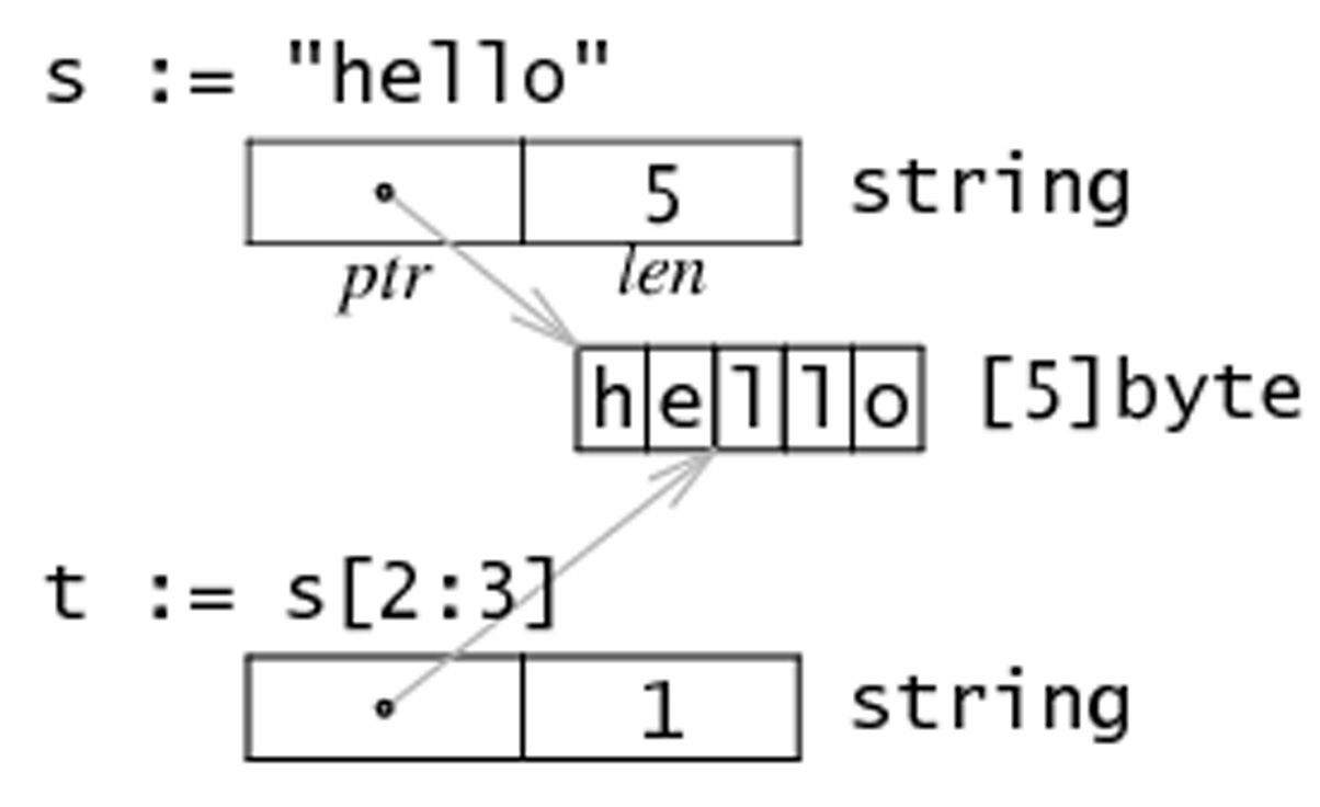 字符串 string s = "hello" 和子字符串 t = s[2:3] 在内存中的结构可以用下图表示: