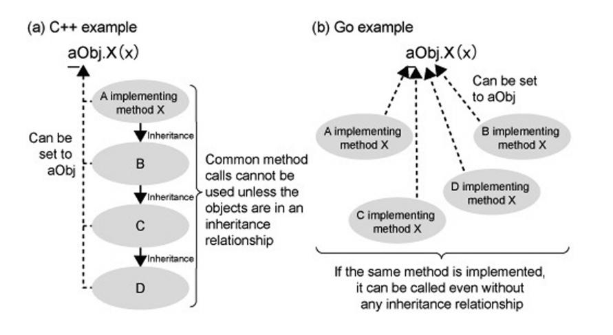 在 Go 语言中,这样的继承层次是完全没必要的:如果方法在此类型定义了,就可以调用它,和其他类型上是否存在这个方法没有关系。在这个意义上,Go 具有更大的灵活性。